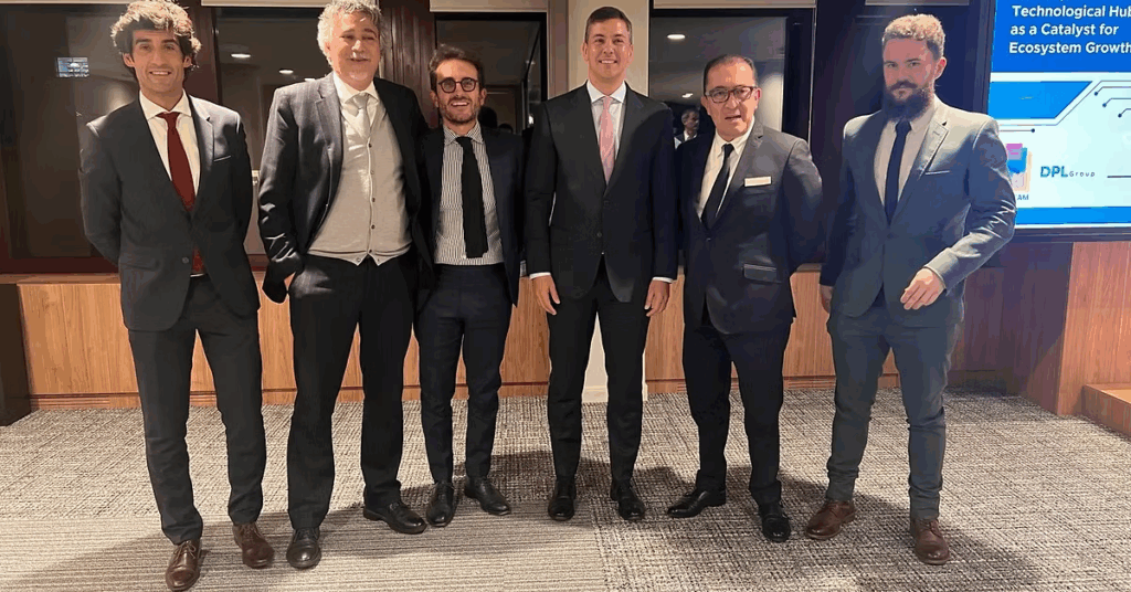 The CCLATAM team in Barcelona with President Santiago Peña. From left to right: Ángel Melguizo, Karim Lesina, Piero Bonadeo, Santiago Peña, Jorge Negrete and Ian Garrahan.